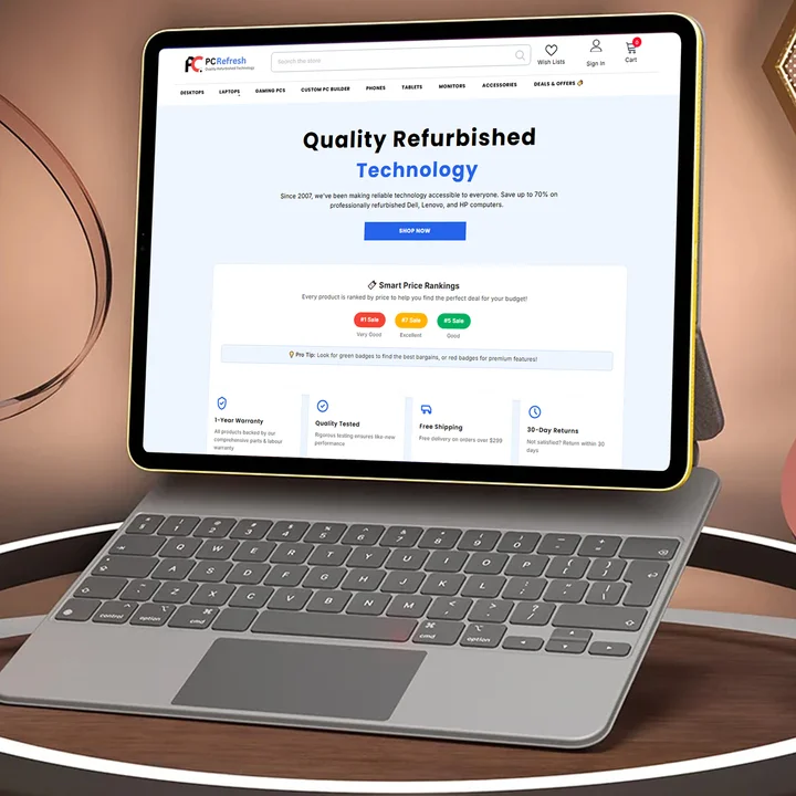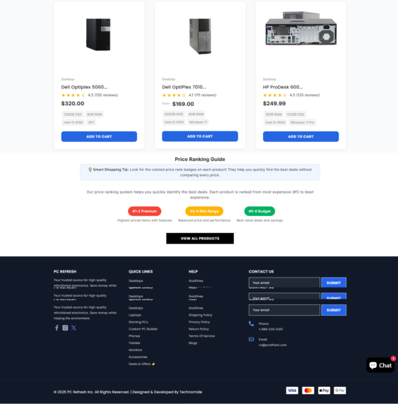 Technomide built PC Refresh’s website to provide a high‑quality, easy-to-use e‑commerce platform where customers can browse, purchase, and order refurbished computers and accessories. The site needed to clearly communicate discount savings (compared to new hardware), warranty and return policies, and product categories (laptops, desktops, tablets, etc.). The aim was to give customers confidence in the refurbished product quality while making shopping and checkout smooth and transparent.
