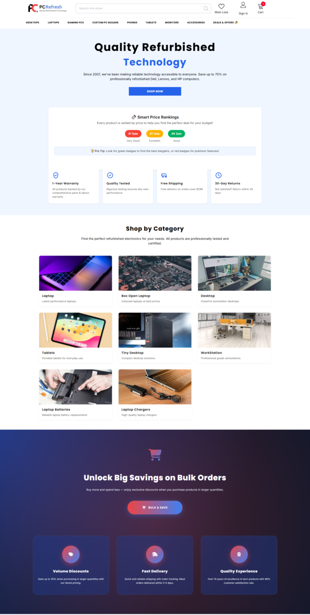 PC Refresh gained a credible digital shopping presence, enabling reach beyond physical markets. The transparent pricing and warranty model help address common buyer concerns about refurbished electronics. The site’s structure supports both individual and bulk orders, widening potential customer base. And because it’s built on a robust e‑commerce foundation, future expansion or updates (new products, categories, deals) are easier to manage.